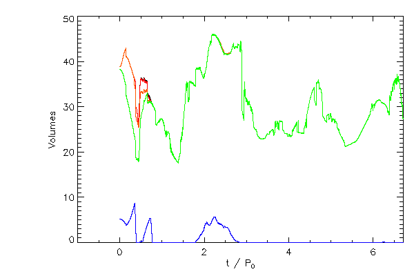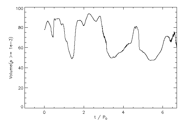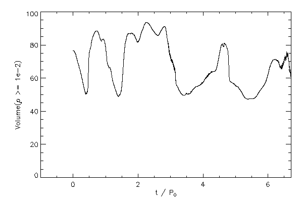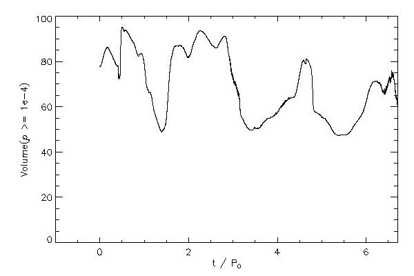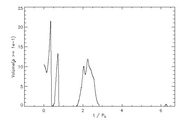 The volume occupied by the star (to various density levels) as a function of time (left panel). The maximum density of the star versus time (right panel).